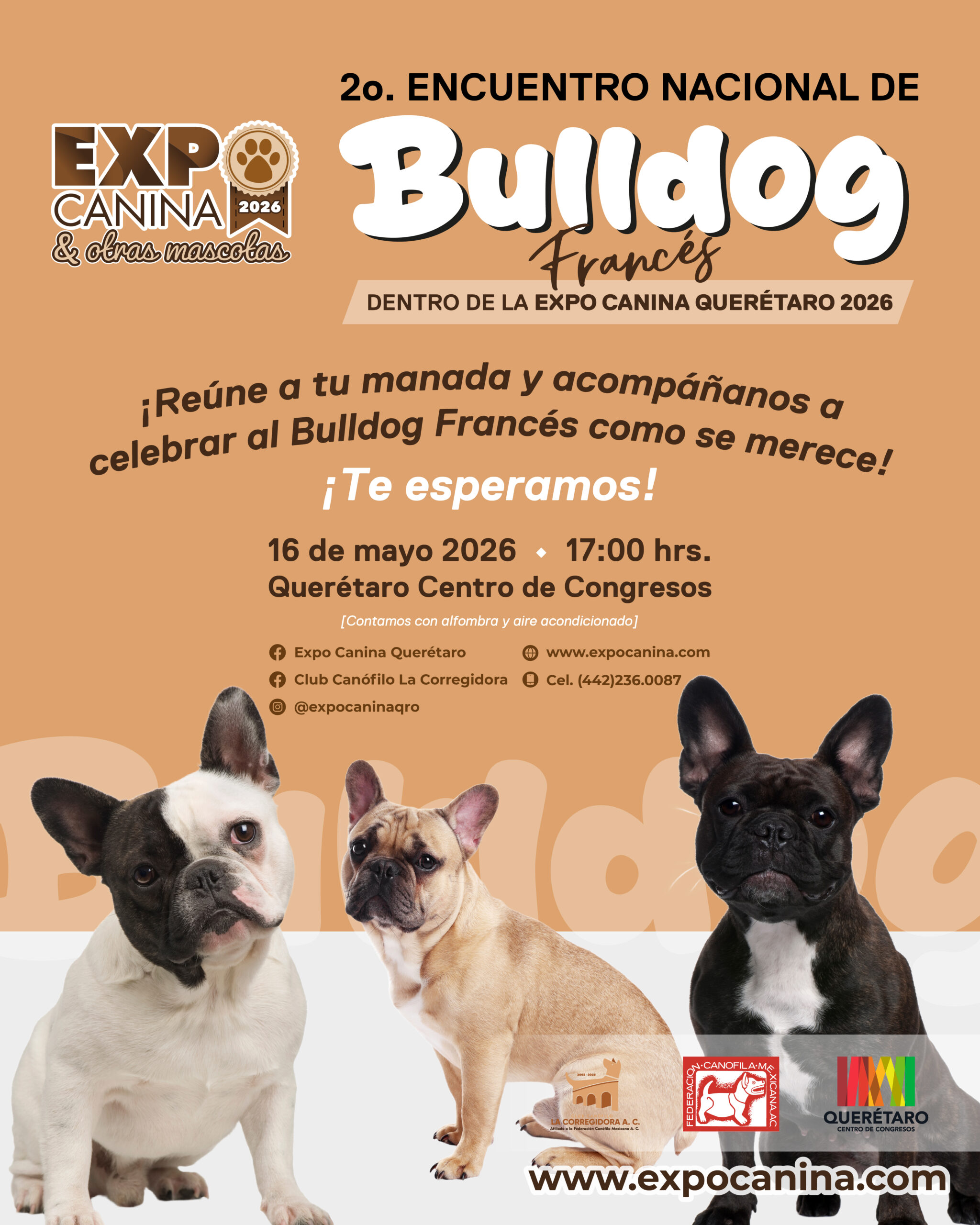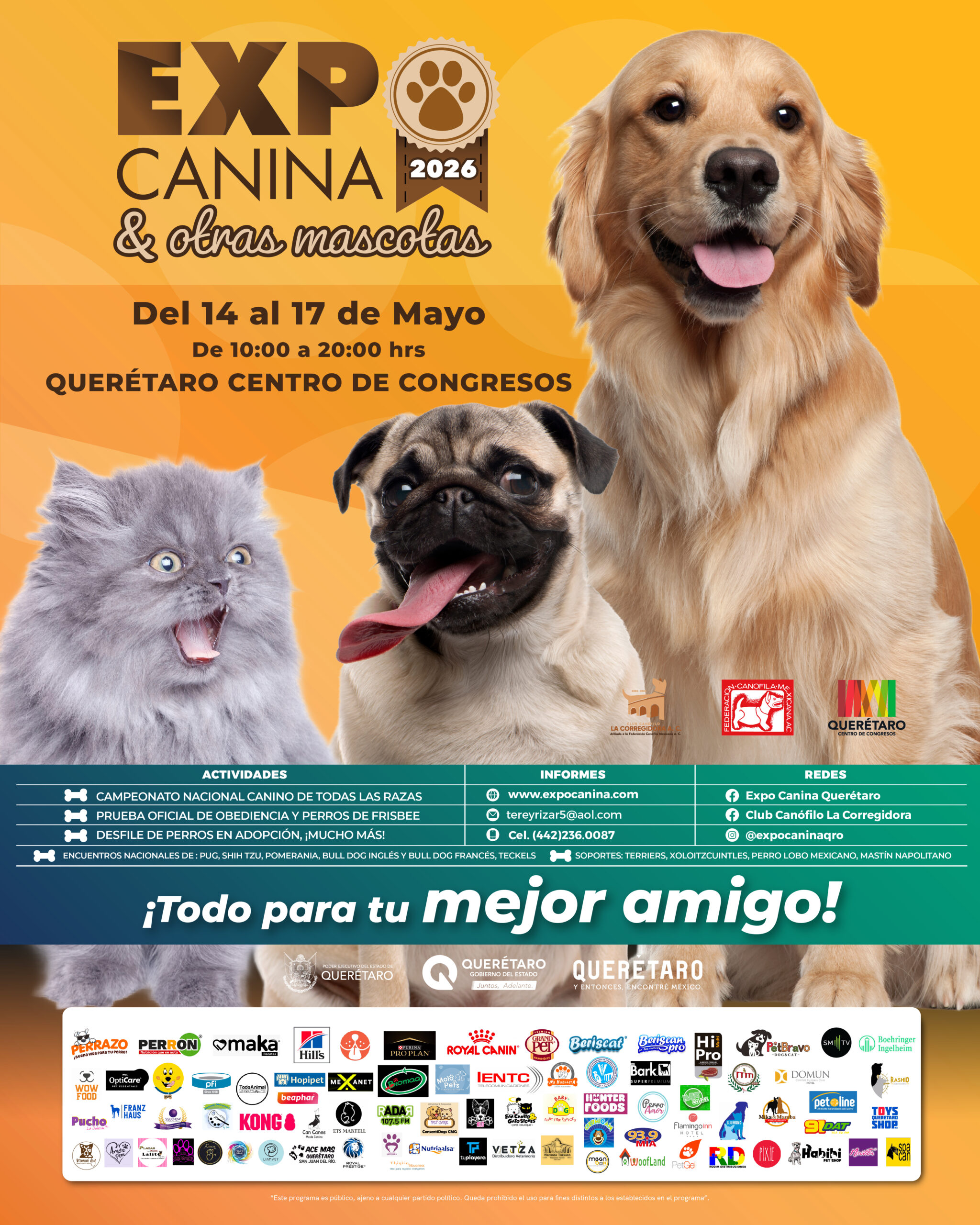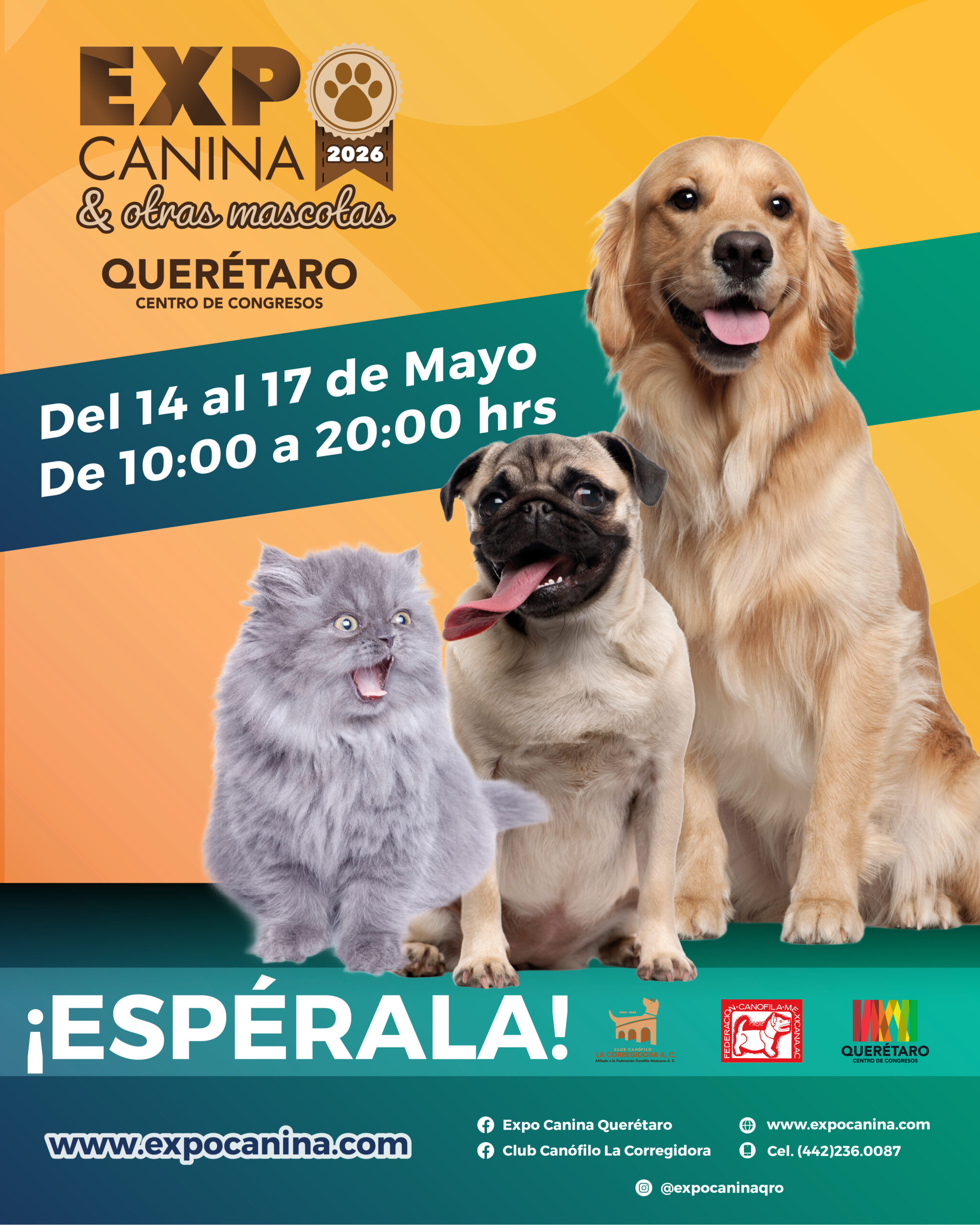 Cuenta con una Exposición Canina y Campeonato Mexicano que reúne a 500 ejemplares de diferentes razas del mundo, junto con una exposición nacional de productos, servicios e insumos de la industria de las mascotas en general: pequeñas especies, mascotas no tradicionales y medicina veterinaria. Este año el evento se llevará a cabo en el Centro de Congresos los días: Jueves 14, Viernes 15, Sábado 16, y Domingo 17 de Mayo, con un horario de las 10:00 a las 20:00 hrs.“EXPO CANINA QUERÉTARO” permite mostrar el vínculo afectivo de las mascotas con sus dueños a través de diferentes concursos y actividades, divididos en 5 áreas: